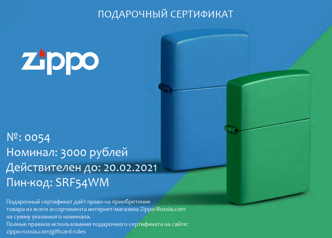 Электронный сертификат гибкого номинала от официального дилера Zippo в Краснодаре. Вы можете дополнительно заказать гравировку, которая подчеркнет Вашу оригинальность и придаст памятность статусному подарку.